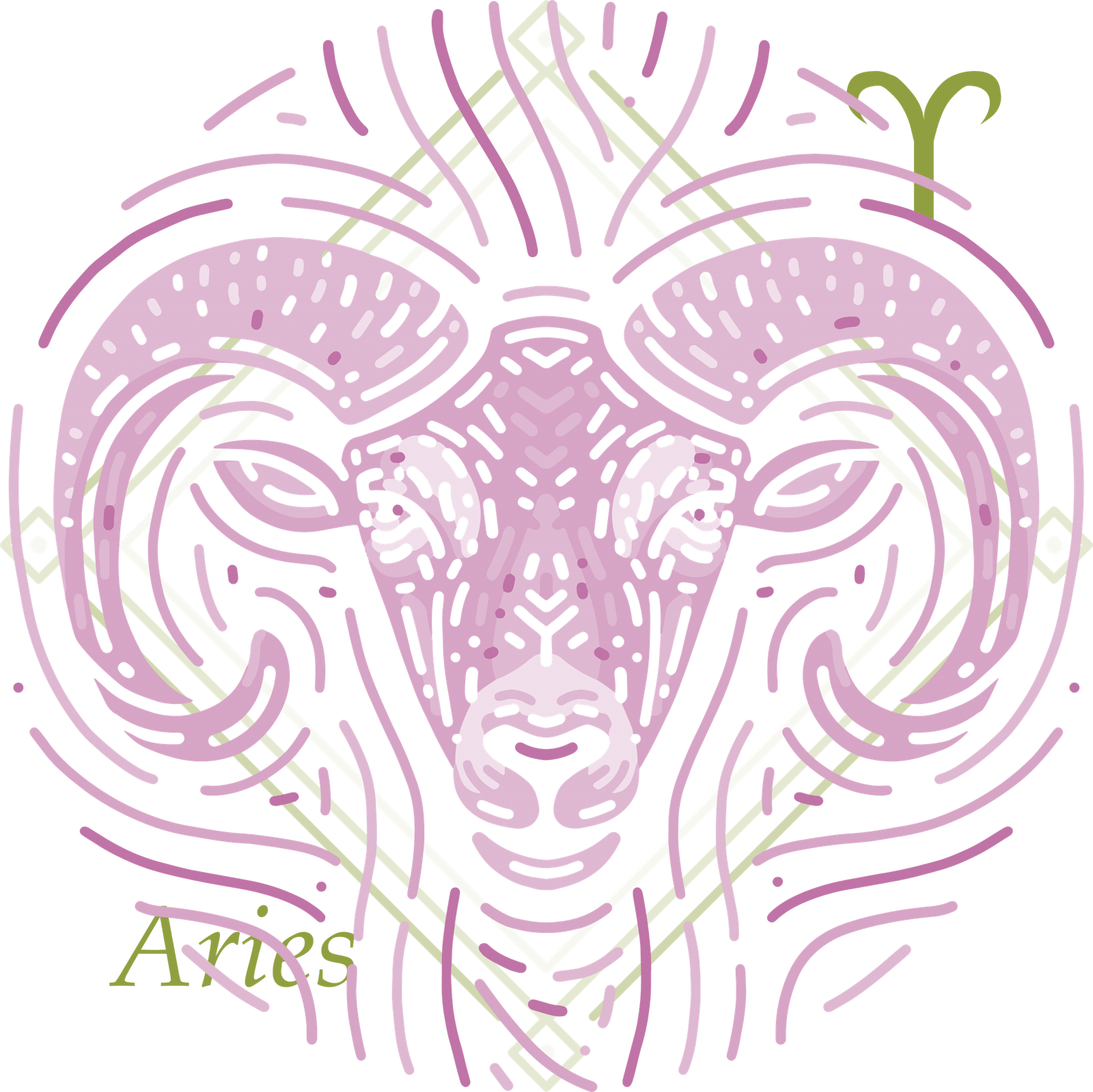 Stylized image of pink ram's head in green frame, Aries words and Aries signYou are determined, independent and have a style that you can truly call your own. You will find your way in life and will definitely achieve your goal, as if you are not afraid of it.