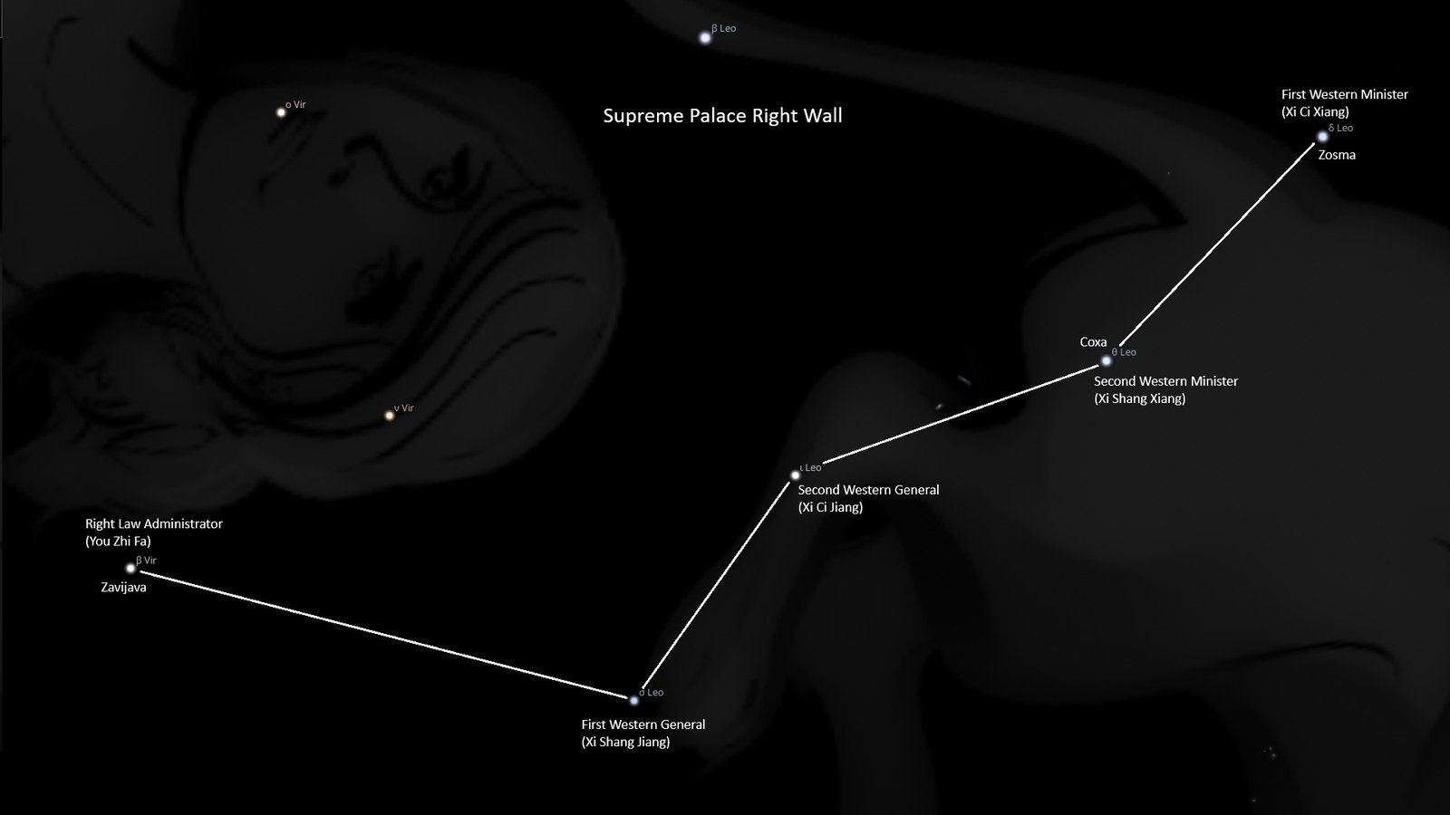 Traditional Chinese astronomy divides the fixed stars into four groups of asterisms (small constellations): twenty-eight houses along the ecliptic and three guards. Each enclosure is surrounded by two “walls” asterisks, left (east) and right (west). Supreme Palace Guard Tai Wei Yuan, known as the “Supreme Palace Guard” Heavenly Court, and (…)