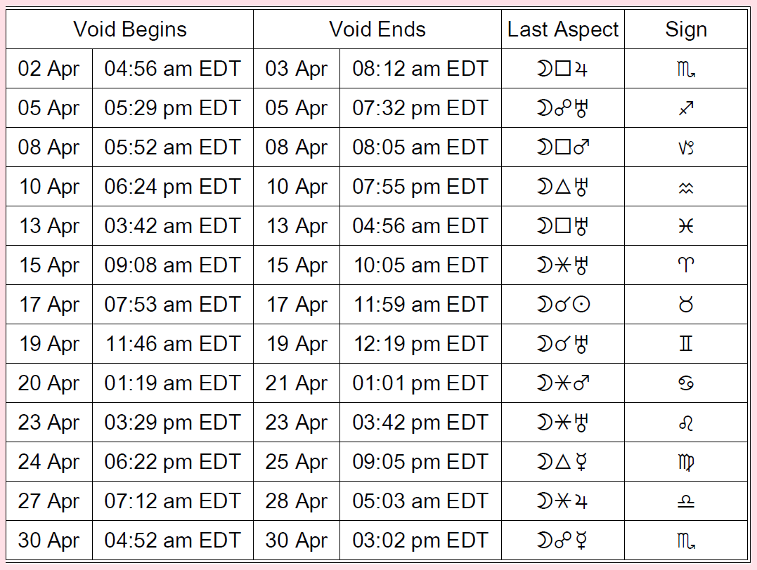Using the chart below: The Moon is void from its last appearance listed below until the Moon enters a new sign. In general, these periods it’s not ideal for starting new initiatives, although they are not an impossible period.